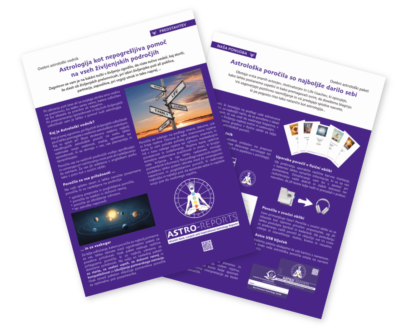 Profesionalna strološka poročila vam bodo razkrila vaše osebnostne lastnosti, skrite talente, spretnosti ter sposobnosti, ki se skrivajo v vas. Skozi navdihujočo in zelo natančno vsebino vas bodo vodila do samospoznavanja ter vas podpirala na vaši življenski poti do uspeha, boljšega zdravja, boljših medsebojnih in partnerskih odnosov, boljšega starševstva ter omogočala lažjo in hitrejšo pot osebne rasti in duhovnega razvoja.